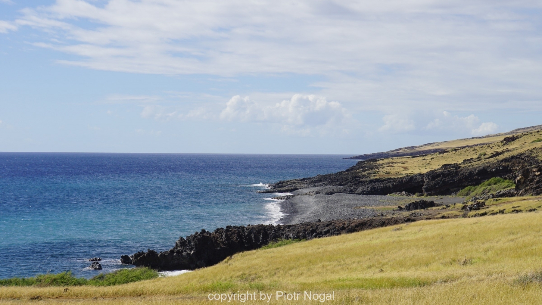 Ab nächsten Morgen radeln wir getrennte Wege. Thomas fährt zurück und ich weiter entlang des „Hana Highways“. Es scheint, dass all der Verkehr nur bis zu dem Naturpark fährt und nicht weiter. Ich treffe den ganzen Tag auf sehr wenig Fahrzeuge. Sobald ich sozusagen im Schatten des Regenwaldes komme, wird die Landschaft trocken und weit. Goldene Gräser, Ausblicke auf das weite Meer und die Nachbarinsel „Big Island“. Ich fühle mich TOP! Zufrieden, fit und frei. Diese Gegend hat aber auch ihren Preis: anspruchsvolles Radfahren auf paar Kilometern Piste, kurzen aber steilen Anstiegen, Sonne, kein Schatten und kein Wasser. Gleich zweimal, unabhängig voneinander, halten zwei Autos an und die Fahrzeuglenker bieten mir Wasser an, dass ich mit verschwitztem Körper und großem Grinser dankend annehme. Von dem einem dieser Herren werde ich gleich mal nach Kanada eingeladen und der andere Herr, kann sich gut in meine Situation versetzen, denn er ist diese Strecke auch schon geradelt.