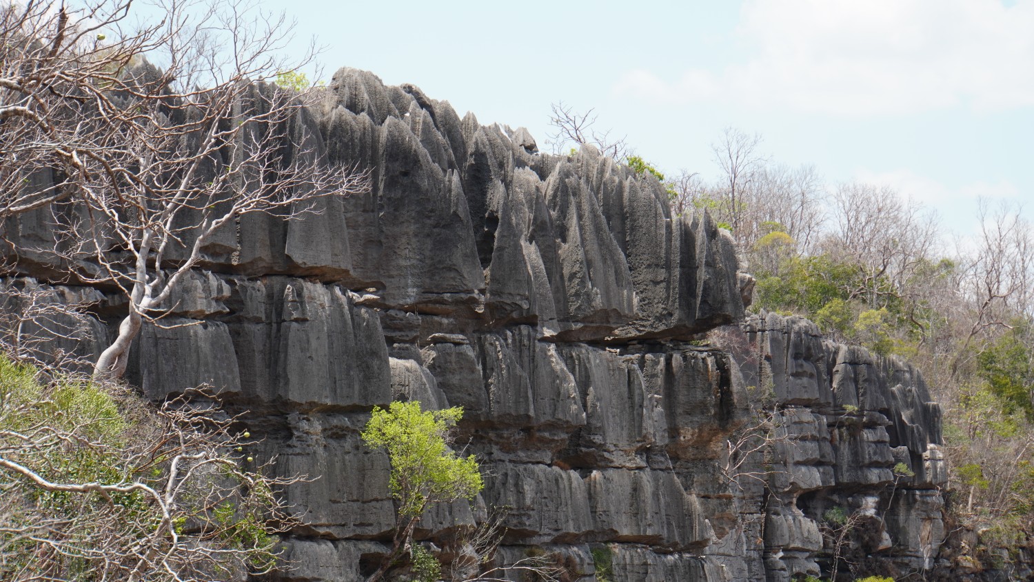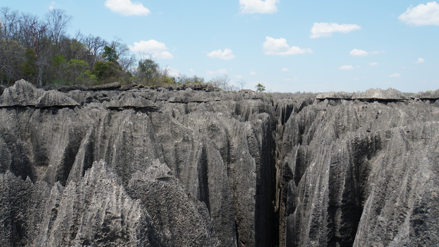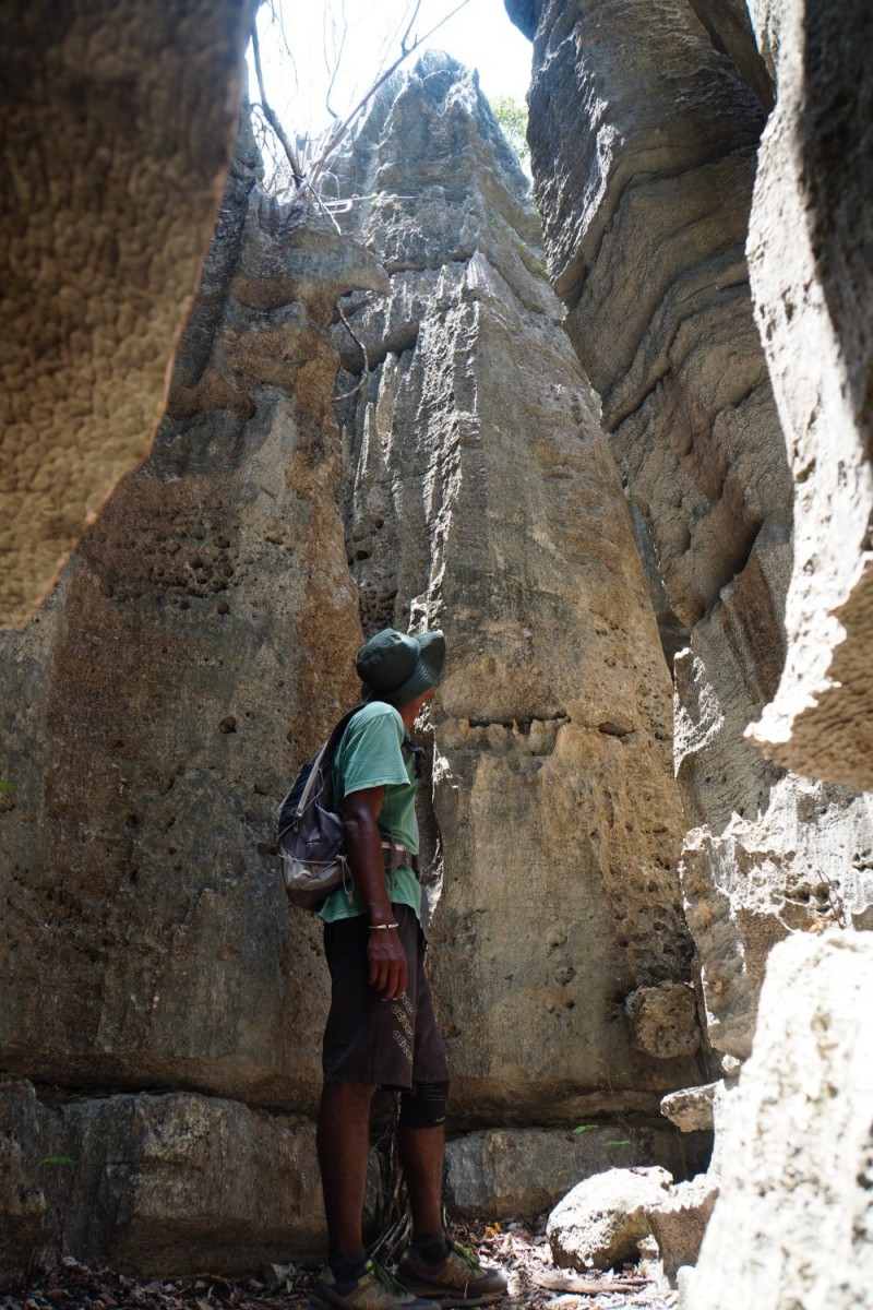 Für die „großen“ braucht man einen Jeep und Fahrer, ich schließe mich einer 2er Gruppe an, die ich am Vorabend anspreche. Was für eine bizarre Landschaft in den beiden Parks. „Tsingy“ heißt in malagasy „auf Zehenspitzen“. Sieht man erstmal diese Kalkstein-Formation, versteht und spürt es selbst. Spitzig scharfe Kanten, auf denen man dahin balanciert.