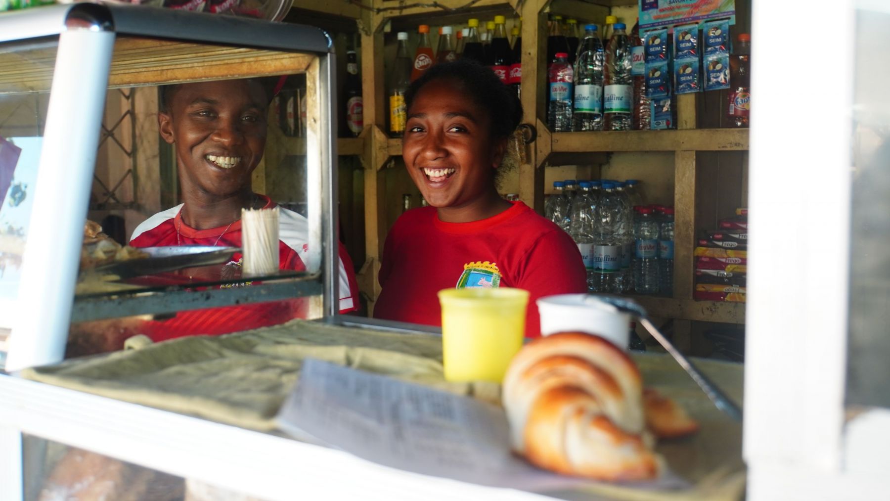 Bei einem Stop, bieten Verkäuferinnen ihre Ware an.