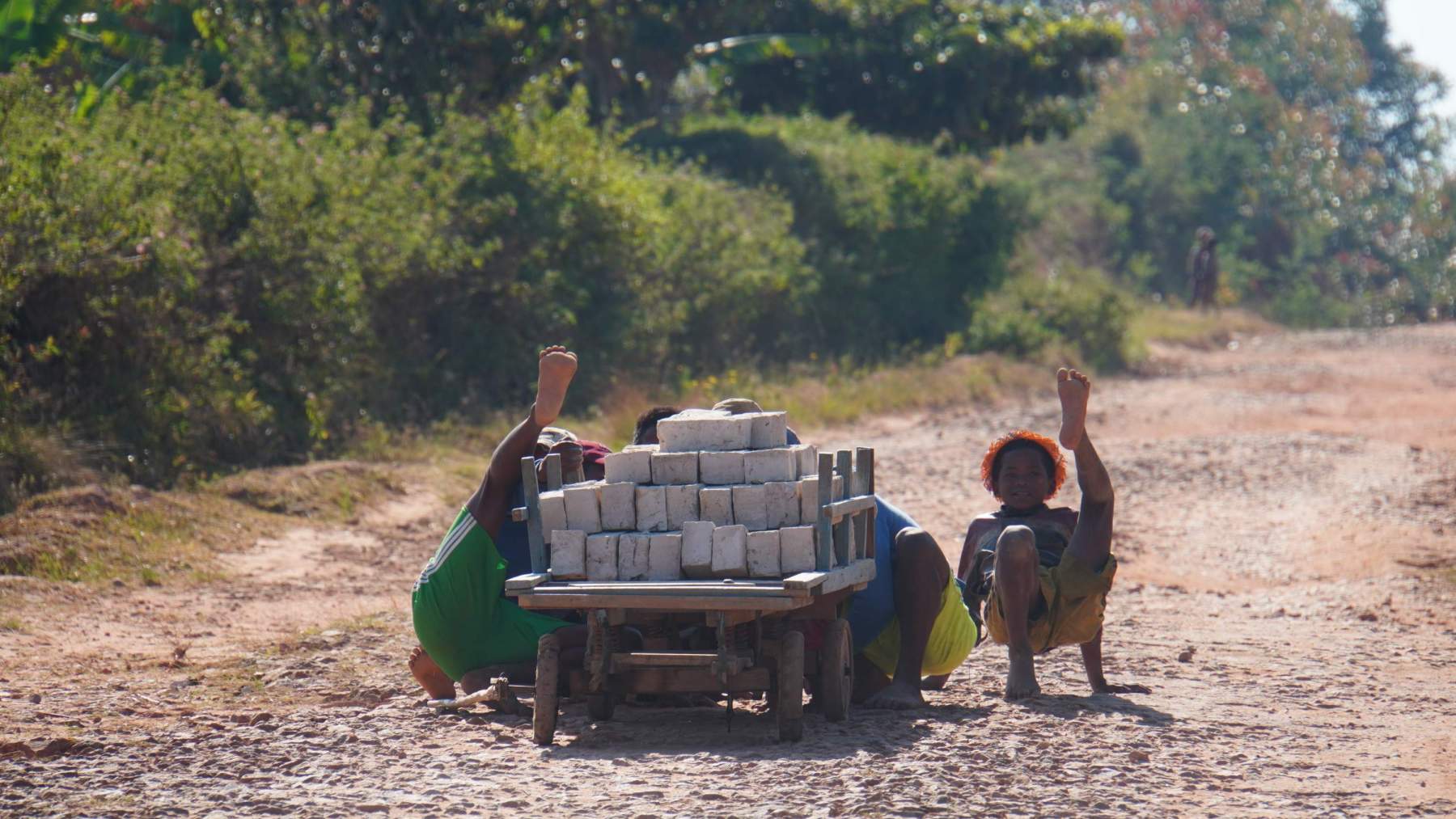 Frauen waschen Kleidung an den Flüssen oder in den Reisfeldern. Männer hingegen die Autos/Fahrräder/Rickschas. Kinder spielen zum Teil mit selbstgebauten Spielzeug aus zB. Holzstecker, Nagel und zwei Kapseln oder Fußball mit einem „Ball“ aus zusammengeknüllten Pladtiksäckchen und diese fest zugeschnürt. Links und rechts lodern die aufgetürmten Ziegelbauwerke zum Ausbrennen und wo einst Bäume standen brennen jetzt kleine Kohlenmeiler um die Kohle zu verkaufen oder selber zu nützen.