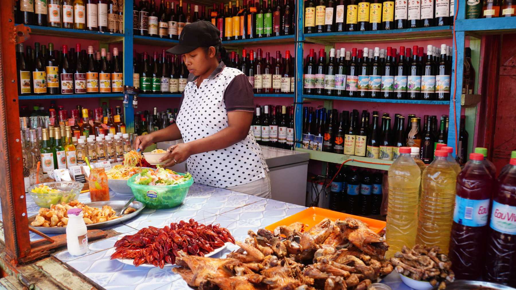 Bei einem Stop, bieten Verkäuferinnen ihre Ware an.
