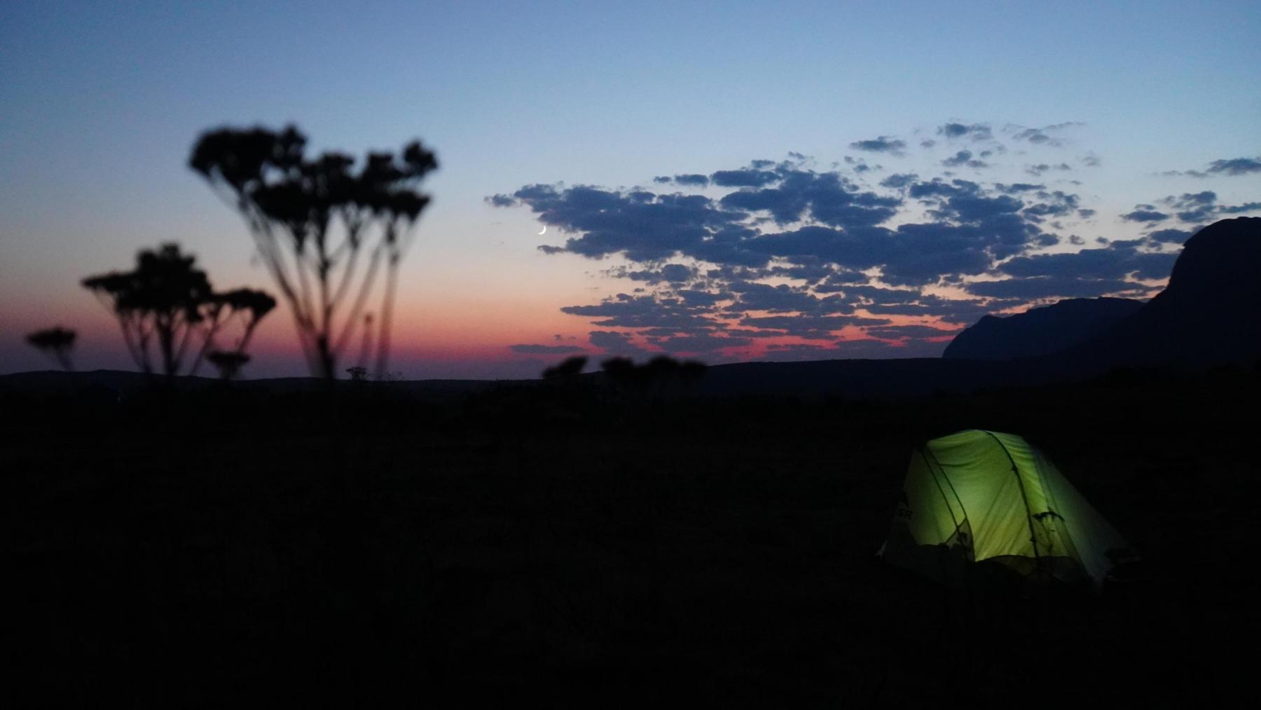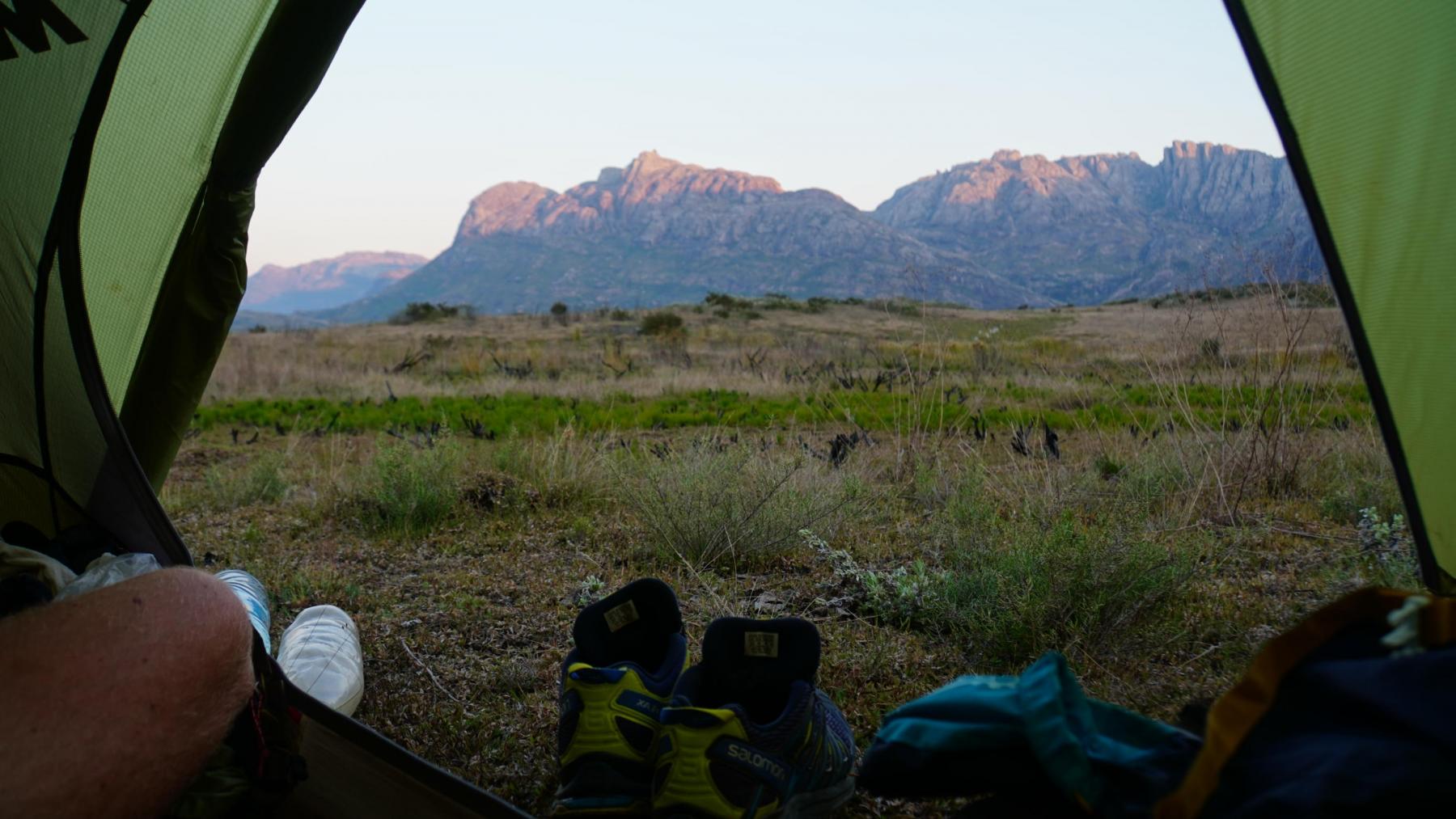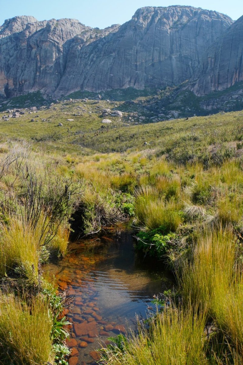 Ca. vier Stunden später erreichen wir das Ticket-Büro. Ich packe meinen Rucksack, stelle Shui ab, kaufe das Ticket, bekomme Guide „Justin“ zugeteilt und los gehts. Wir marschieren 14 km, legen einen Stop an einem flachen Wasserfall zum Baden und Rasten ein und erreichen schließlich das Basislager auf 2082m, wo ich mein Zelt aufstelle. Die Landschaft ist soooo viel anders als sonst wo bisher auf der Insel. Gefällt mir richtig gut und dann noch die hohen Berge, Insekten, Chamäleons und Vögel!! Der Himmel in der Nacht so klar, die Luft schön kühl, herrlich zum Schlafen.