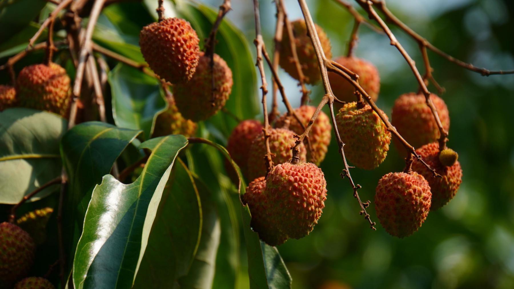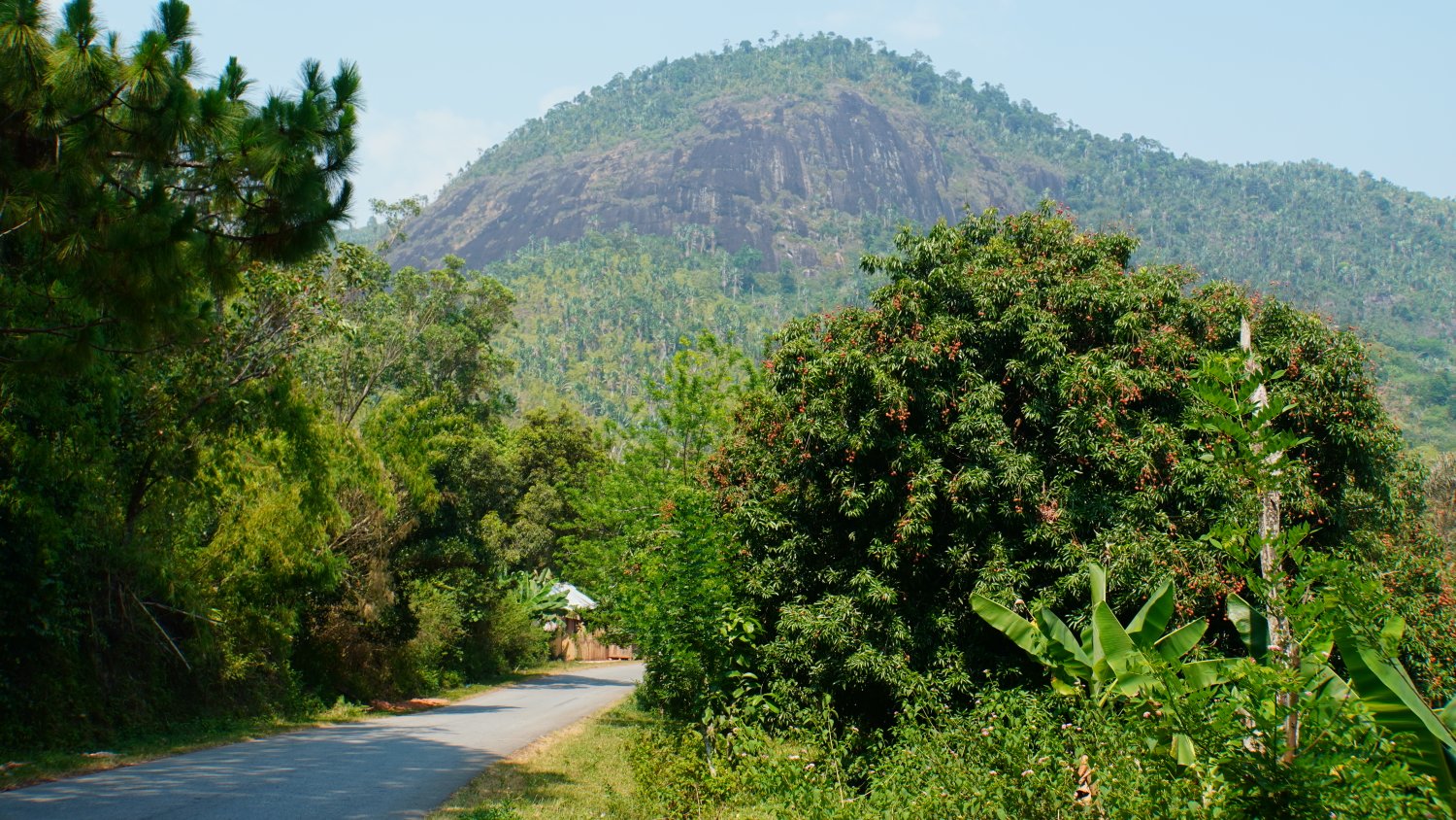 Das änderte sich dann ab nächsten Tag, als ich tiefer fahre. Es wird zunehmend wärmer und schwüler. Was da alles an Früchten wächst! Wow! Überhand nehmen zu dieser Zeit die Litchis. Wie wir es bei den Kirschbäumen kennen, sehen hier die Bäume mit den Litchi-Früchten aus: überall kleine rote Kügelchen. Ich pflücke mir hier und da welche und vernasche sie während der Fahrt.